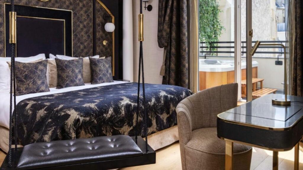 L’objectif est l’effervescence, la joie de vivre, par la stimulation des sens. Esprit Gatsby le magnifique, fauteuils de velours, tables et allées de marbre, ambiance des années folles, voilà de quoi inviter vos sens ailleurs, loin. Et ce, dès votre arrivée au rez-de-chaussée art déco, où d’élégants palmiers surmontés de plumes d’autruches se courbent, saluent. Les plafonniers de cristal de Castro Lighting rivalisent avec le luminaire central menant aux étages, déployé sur 18 mètres…Papier panoramique créé pour le restaurant avec Anabo et mur végétal des Jardins de Babylone sont de la partie. Un mobilier signé Henryot, et une magie des lieux, savamment créée par Sandrine Alouf. Le patio saura vous surprendre à la nuit tombée avec ses jets d’eau arc-en-ciel. Le spectacle aquatique et lumineux se poursuit tout au long du diner. La soirée continue côté spa, en terrasse ou dans les chambres. Chacune est un voyage, a son style bien particulier. Toutes, offrent luxe calme et volupté, fantaisie aussi. Une balançoire argentée ou noire surgit du plafond, comme tombée du ciel. Tout près, un spa pour deux bouillonne et frémit à l’idée de vous accueillir.