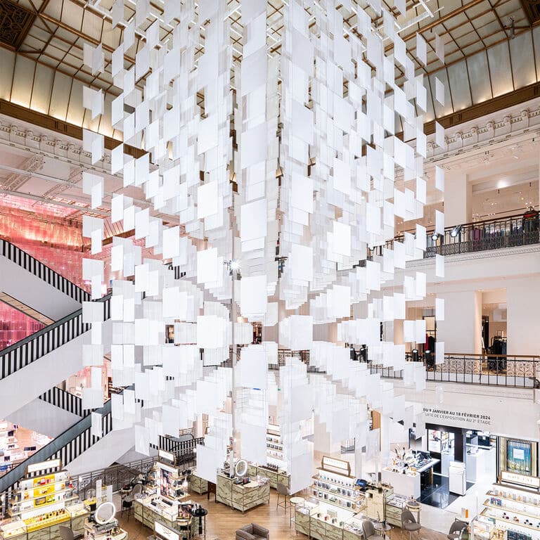 Le grand magasin se transforme ainsi en un espace où l’art contemporain dialogue harmonieusement avec l’architecture classique. Les créations de Buren révèlent une interconnexion entre l’œuvre et l’espace qui l’entoure, créant une symbiose entre l’artiste et le lieu emblématique.