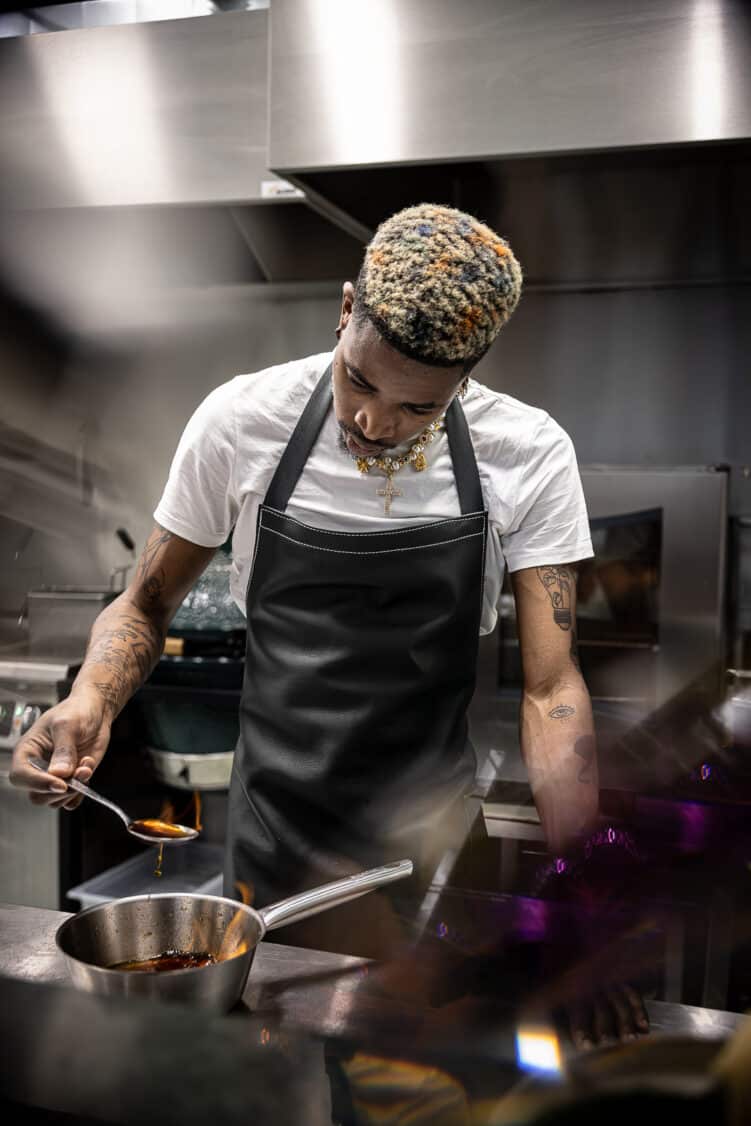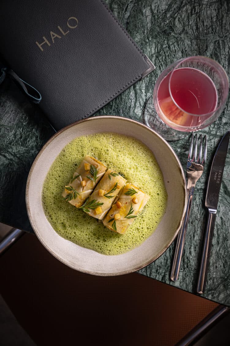 Halo nécessitait un chef à la personnalité forte et créative pour parfaire le projet. Victor Blanchet pose ainsi ses couteaux dans cette cuisine pour y inscrire sa patte. Après avoir intégré le restaurant Belle Rive à Angers en 2018, Victor a ensuite rejoint le restaurant trois étoiles L’Arpège d’Alain Passard. Sa participation à Top Chef en 2023 a également marqué un tournant dans sa carrière, le propulsant sous-chef à L’Arpège. Victor Blanchet propose une cuisine durable, influencée par la fermentation, avec une forte composante végétale et marine. Après un voyage inspirant dans le Sud de la France, il signe pour Halo une carte vibrante et locale, avec des ingrédients sourcés minutieusement.