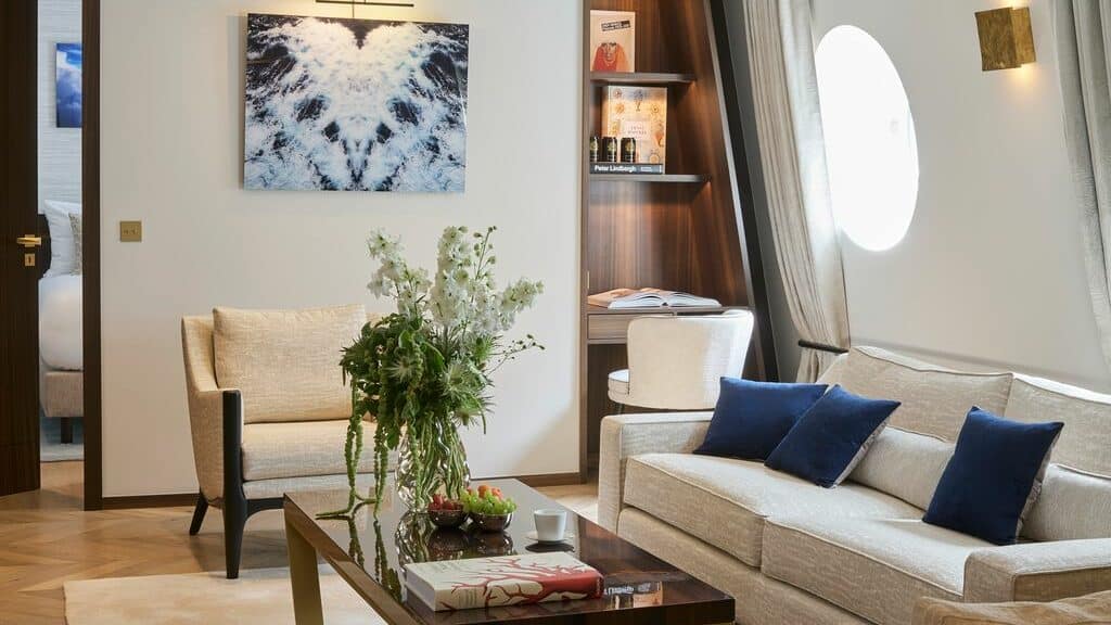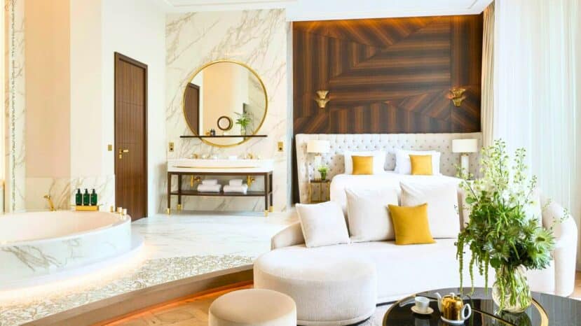 Les suites reflètent cette ambition, intégrant des matériaux nobles comme la porcelaine de Limoges et les cristaux taillés. Le design intérieur signé par Tony Rivas marie élégamment éléments patrimoniaux et créations contemporaines. L’ensemble crée une ambiance à la fois raffinée et apaisante.
