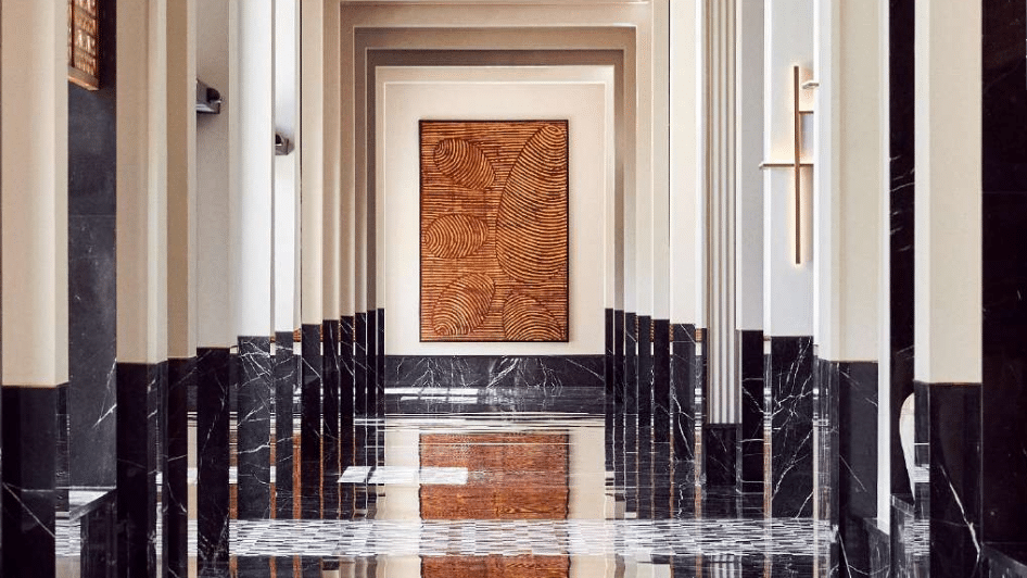Le lobby impressionne par sa pièce monumentale en céramique de Mounat Charrat, suspendue au plafond, symbole du dialogue subtil entre modernité et tradition. Le design intérieur, signé Imaad Rahmouni, marie les codes arabo-berbères aux lignes contemporaines, avec des matériaux nobles : céramique, marbre, pierre de Taza, laiton, tapis tissés main et moucharabiehs délicats. Chaque angle, chaque perspective est pensée comme un tableau vivant, invitant à l’émerveillement.