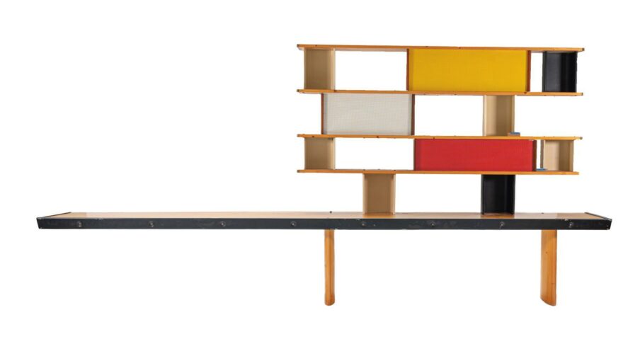 Bibliothèque ‘Tunisie’, créée pour le Pavillon de la Tunisie de la Cité Universitaire Internationale 1952 Pin, acier peint, tôle d’aluminium embossée en pointe diamant peinte .162 x 353 x 53 cm .Collection Christian Mattler, Paris .Estimation : 150 000 – 200 000 € . © Christie’s Images Limited 2025