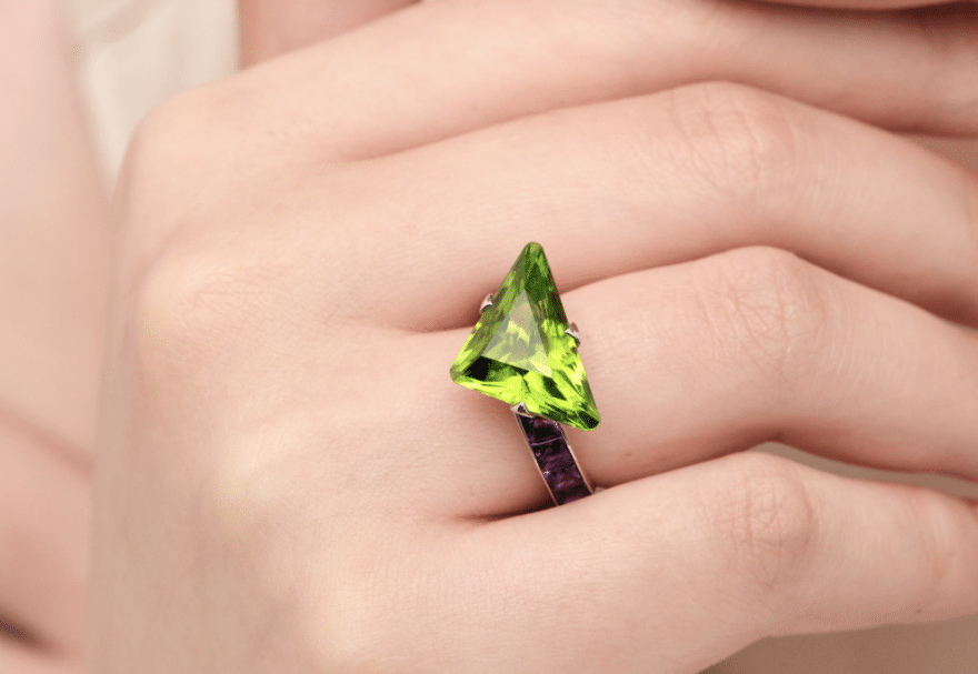 - Les designs privilégient des combinaisons de pierres aux teintes vives : améthyste, aigue-marine, morganite, citrine et bien sûr – la péridot.