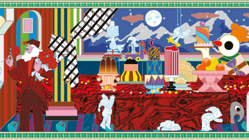 Sur le boulevard Haussmann, les vitrines se transforment en un véritable atelier magique où s’activent lutins, bébé éléphant, Père Noël et canard botté. Jeanne Detallante s’est plongée dans les archives des Galeries Lafayette pour créer une fabrique enchantée qui rend hommage aux arts décoratifs et au patrimoine du magasin. Chaque tableau raconte un fragment d’histoire : ici, les lutins emballent des cadeaux, là, un banquet s’anime sous les guirlandes. Fidèle à son style baroque et coloré, l’artiste mêle exubérance, humour et tendresse. Son univers s’étend jusque dans les papiers cadeaux et les sacs du magasin, transformant chaque achat en souvenir enchanté. Sous la Coupole classée monument historique, le grand sapin de 16 mètres en impose. Orné de rubans spectaculaires (560 kilos !), de 8 kilomètres de guirlandes LED et de 300 kilos de tissus, il scintille des illustrations de Jeanne Detallante et fait figure d’œuvre d’art à part entière.