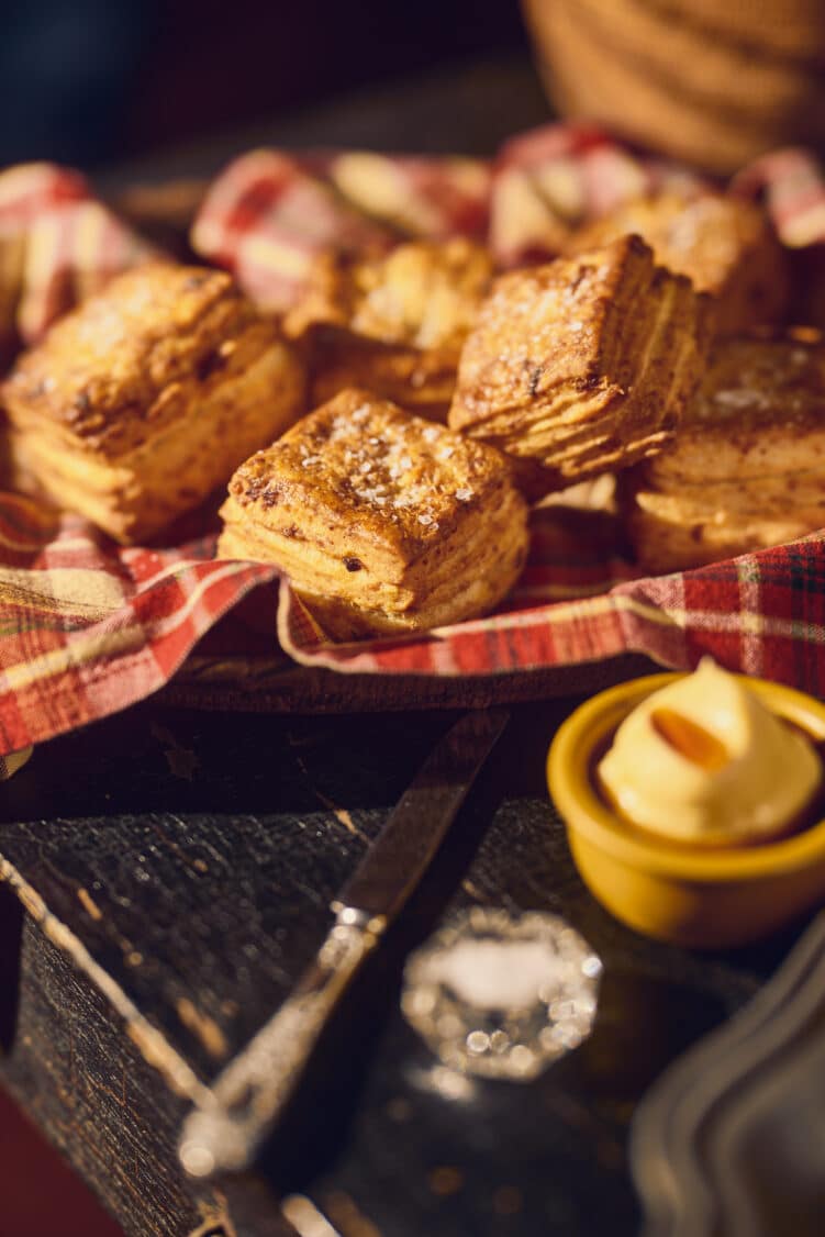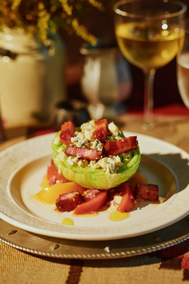 En ouverture, les Cast-Iron Biscuits au cheddar fumé et au sirop d’érable au beurre salé plantent le décor : un équilibre parfait entre douceur et caractère. Suit la Colorado Wedge, une salade composée de tomates anciennes, bacon glacé au whisky et fromage bleu Rogue River — fraîche, gourmande et typiquement américaine.