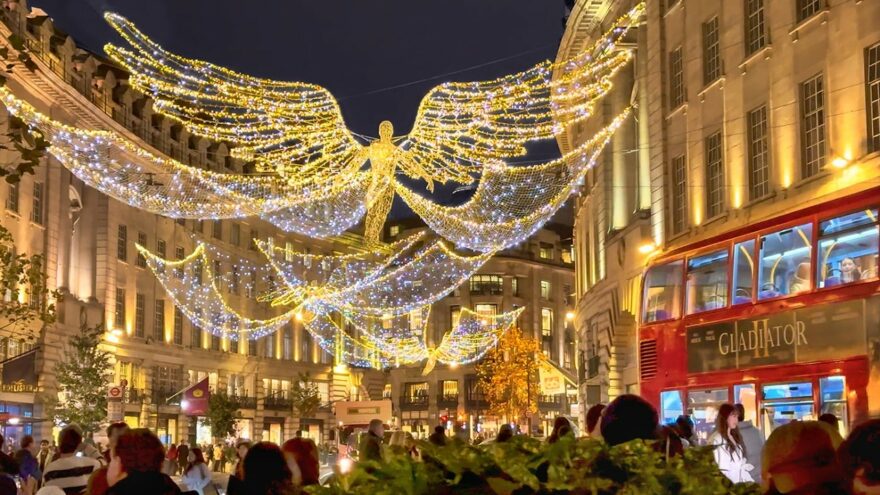 - Regent Street déploie ses anges majestueux, suspendus au-dessus de l’avenue comme un ballet d’esprits lumineux.