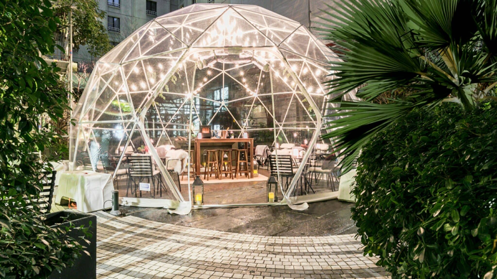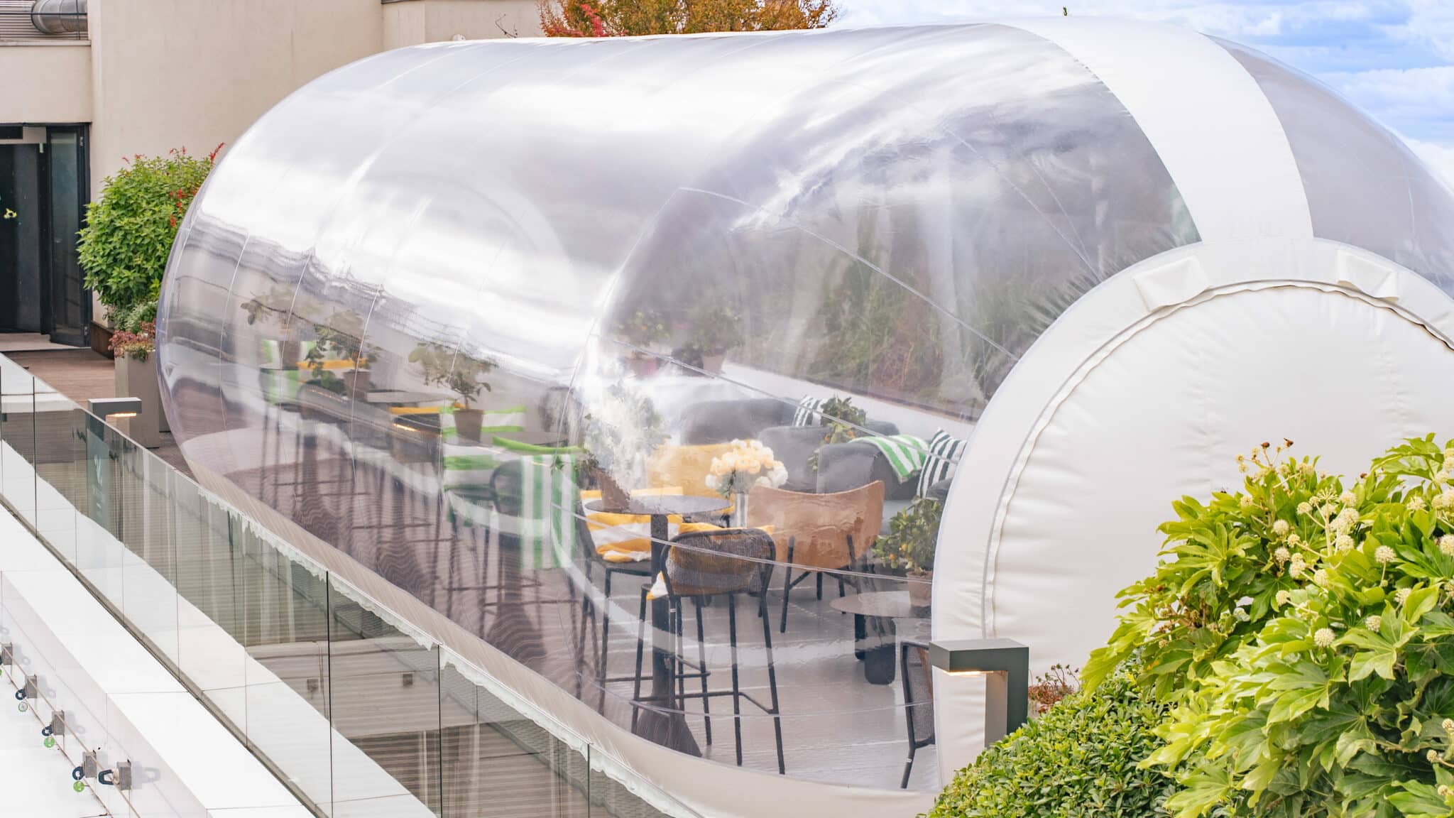 Dans le jardin somptueux de l’Hôtel du Collectionneur, une bulle au design chic s’installe parmi les arbres illuminés. L’ambiance mêle touches dorées, chaleur douce et esprit Art Déco, signature de la maison. On s’y rend pour un apéritif d’exception, un verre de champagne, ou quelques bouchées raffinées dans un cadre à la fois cosy et élégant.