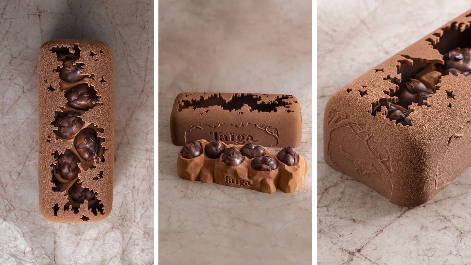 Sous une coque en chocolat noir intense, aux coutures finement sculptées, se cache un jeu de textures et de saveurs : base croustillante à la noisette, ganache montée au chocolat noir, crémeux caramel fondant et cœur coulant au caramel. Le tout compose un dessert audacieux et raffiné, à la croisée du style et de la gourmandise. Cette bûche inédite mêle l’esprit couture de Rouje et l’héritage pâtissier d’Angelina, maison emblématique depuis 1903. Une création pensée comme un accessoire… mais à dévorer.