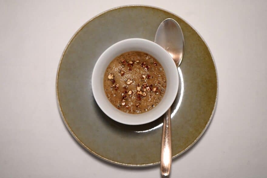 Arrive ensuite l’amuse-bouche, tout en douceur végétale : une crème de topinambour coiffée d’une mousse façon cappuccino, parsemée de truffes noires. Une bouchée qui réchauffe, à la fois soyeuse et profonde.