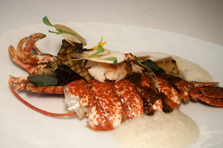 L’entrée met à l’honneur la mer sous un angle festif : noix de coquille Saint-Jacques, brocolini, cresson, sauce kaffir, crème d’avocat et truffe noire composent une assiette à la fois iodée, verte et très raffinée.