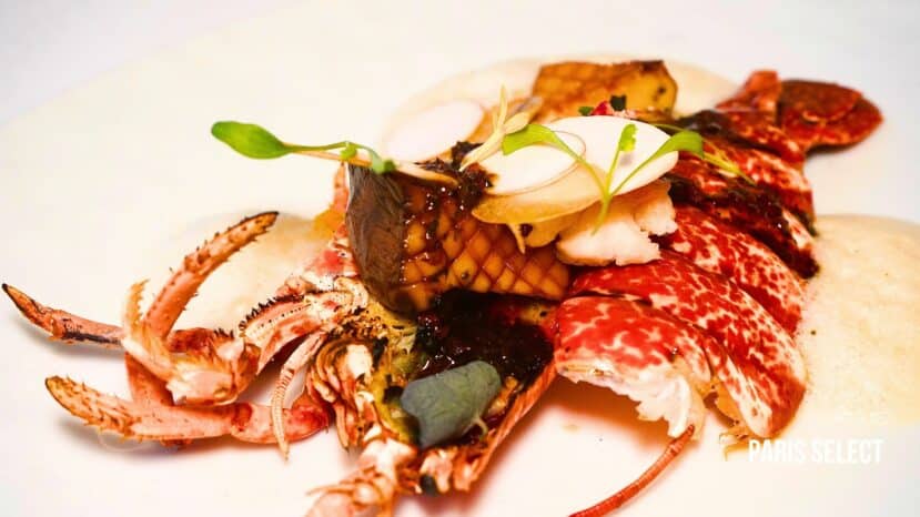 La deuxième entrée fait monter le registre du luxe, tout en restant d’une grande délicatesse : homard bleu, nappé d’une sauce champagne et escorté de caviar. Une assiette de fête, mais tenue, sans lourdeur.