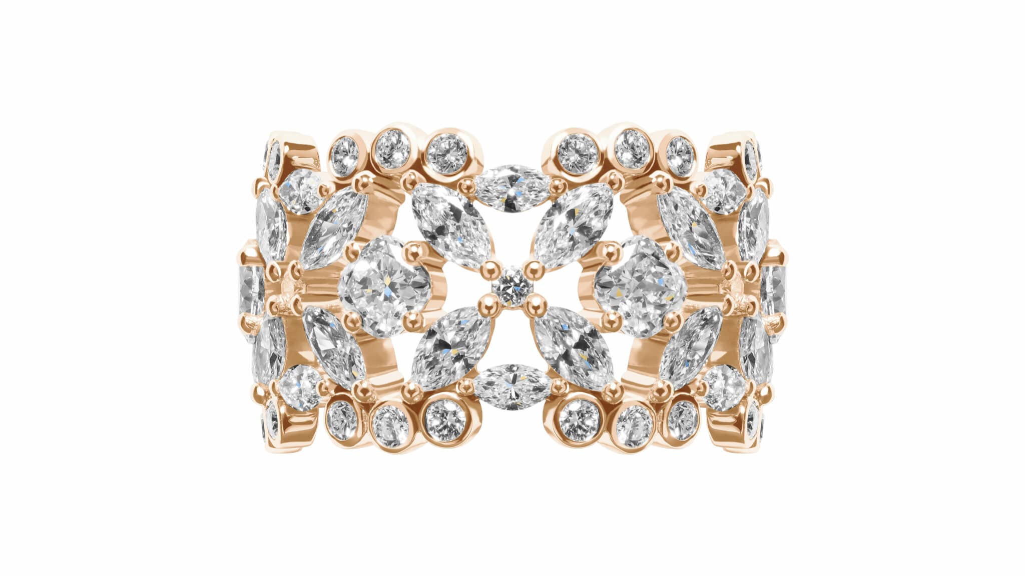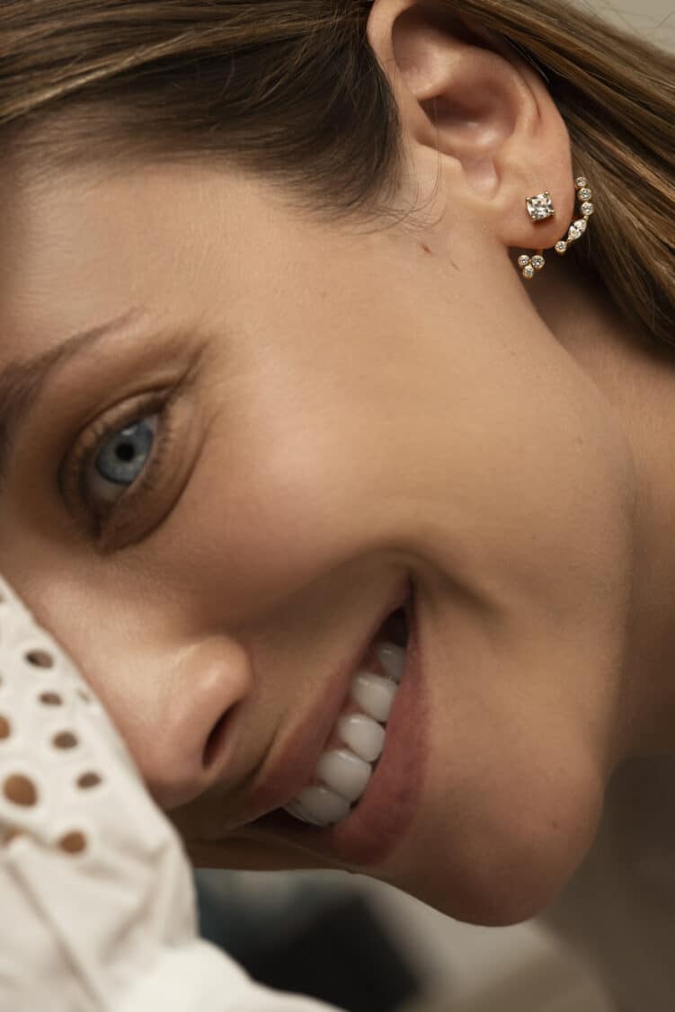 Les pièces se déclinent en or jaune, rose ou blanc 18K, toujours serties de diamants de culture. On imagine la Bague Broderie M, constellée de 3 carats de diamants (6 490 €), glisser à l’annulaire comme une promesse. Le Bracelet Broderie jonc ouvert, posé sur le poignet avec ses 2,2 carats (9 490 €), ressemble à une manchette délicatement ajourée. Le Collier Broderie asymétrique, 2,4 carats de lumière (5 990 €), encadre le cou comme un col brodé, tandis que la Mono boucle Broderie feston, à 2 250 €, souligne la courbe de l’oreille avec 0,8 carat finement serti.