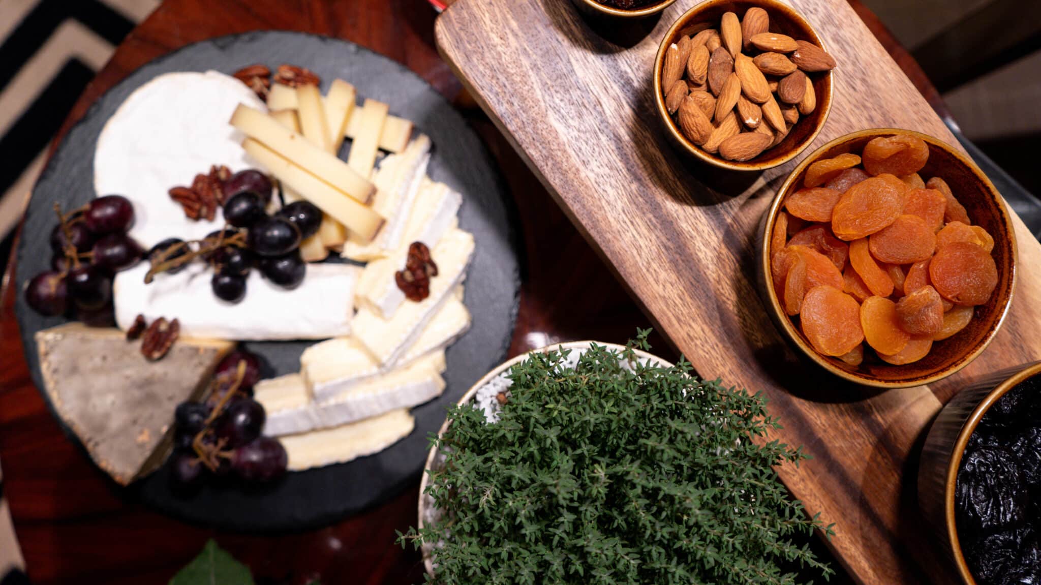 Le moment se poursuit avec un éventail de fromages affinés, comprenant un brie aux fruits secs, du Laguiole, un chèvre au miel et thym, du roquefort et du livarot, le tout servi avec un assortiment de pains spéciaux.
