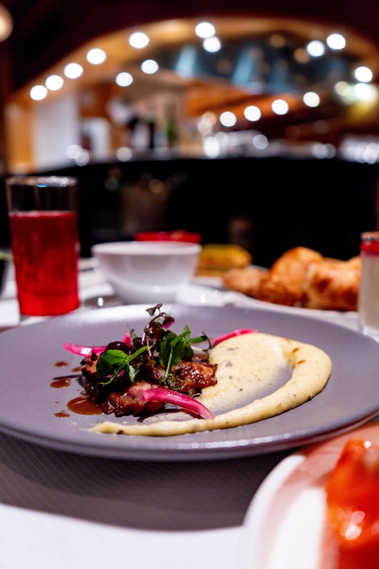 Vient ensuite un éventail généreux d’inspirations froides, parfait pour varier les plaisirs. Le brunch propose un assortiment de sushis et makis, un pâté en croûte servi avec pickles de légumes-racines, du jambon Serrano affiné et de la coppa artisanale. Le foie gras, accompagné de pain brioché tiède et d’un chutney d’hiver, s’inscrit parmi les incontournables. On retrouve aussi une salade de magret fumé avec endives, noix et pommes, des wraps de volaille au miel et légumes aux herbes fraîches, et une tourte de volaille aux champignons, châtaignes et noisettes grillées. Une sélection de crudités, condiments et vinaigrettes maison complète cet ensemble savoureux.