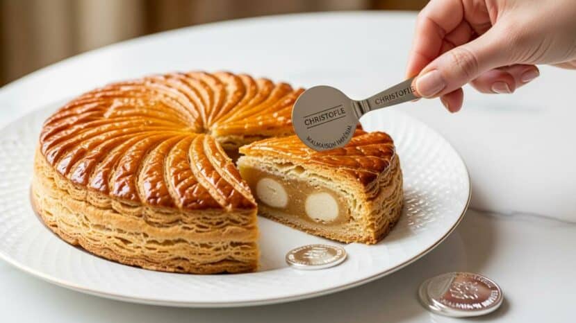 On retrouve le geste du partage, puis le jeu de la fève. Au fil des parts, cette galette des rois raconte une fête sobre, mais généreuse. Par ailleurs, la couronne signée apporte l’étincelle de saison.