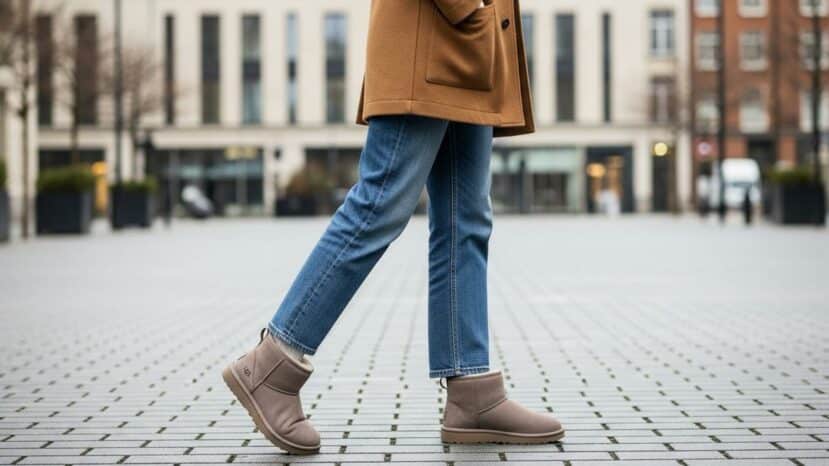 Côté technique, UGG conserve une doublure laine et une tige douce, agréable au quotidien. De plus, une semelle légère absorbe les chocs en ville et accompagne les longues marches. Le confort reste intact, mais la ligne gagne en finesse, ce qui affine la silhouette dans la plupart des looks.