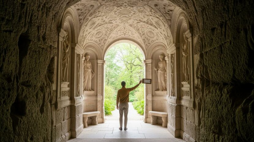 Dans la seconde pièce, la grotte impose sa fraîcheur. Des marbres clairs et des motifs allégoriques surgissent, selon les sources, autour d’une figure nourricière. De plus, l’eau réelle ou suggérée renforce l’idée d’une nature apprivoisée.