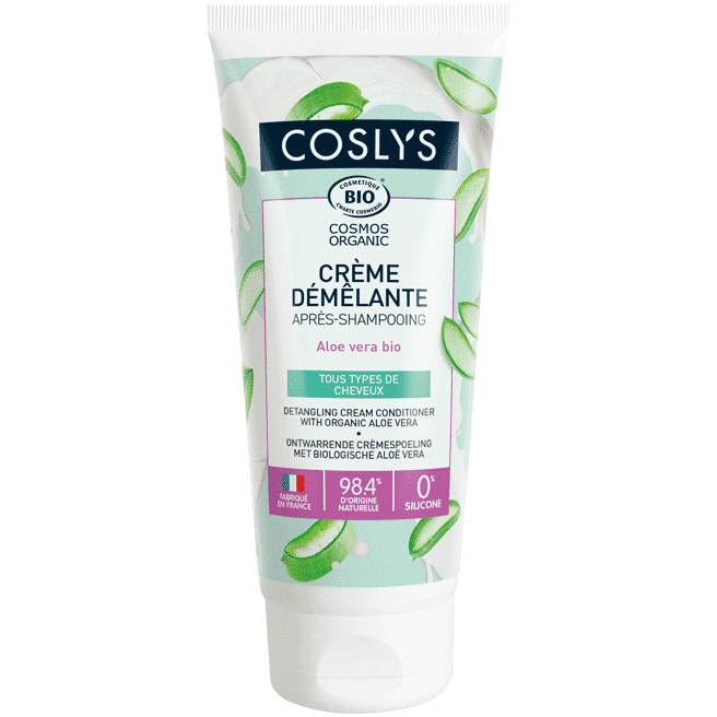 Après le rinçage, place à un démêlant doux de chez Coslys, posé sur les longueurs et les pointes. Il facilite le passage du peigne sans casse et laisse le cheveu souple, prêt à recevoir le reste de la routine.