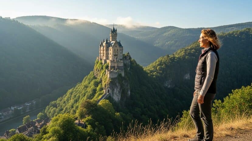 La forteresse se dresse au-dessus de vallons, rivières et chênes, avec une présence tranquille et rassurante. Ainsi, la vue balaie la vallée, les falaises, puis les villages dorés, alignés le long des méandres. D’ailleurs, on comprend vite ce choix d’éperon rocheux, pensé pour voir venir et tenir bon.