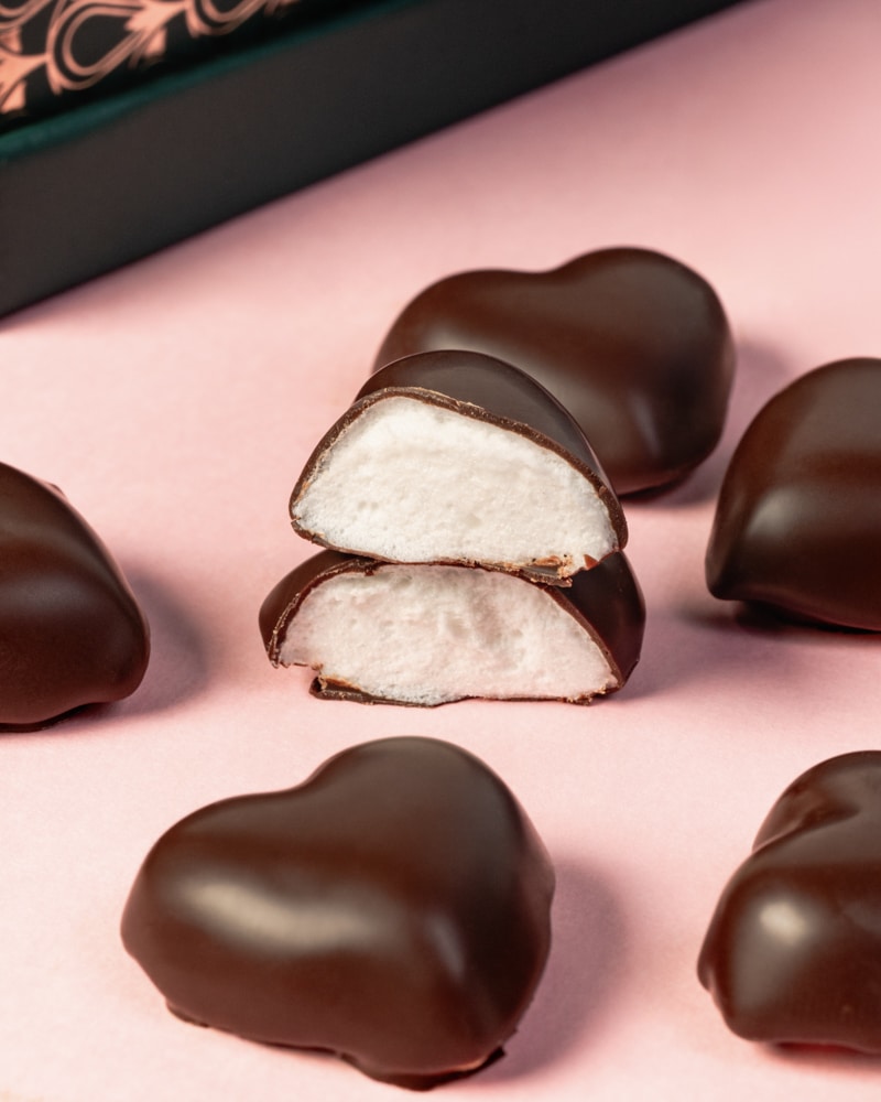Plus régressif, le Petit cœur guimauve joue la carte de la tendresse. La guimauve moelleuse, enrobée d’une fine coque de chocolat noir, fond doucement en bouche. À picorer à deux ou à offrir comme un geste attentionné, presque intime.