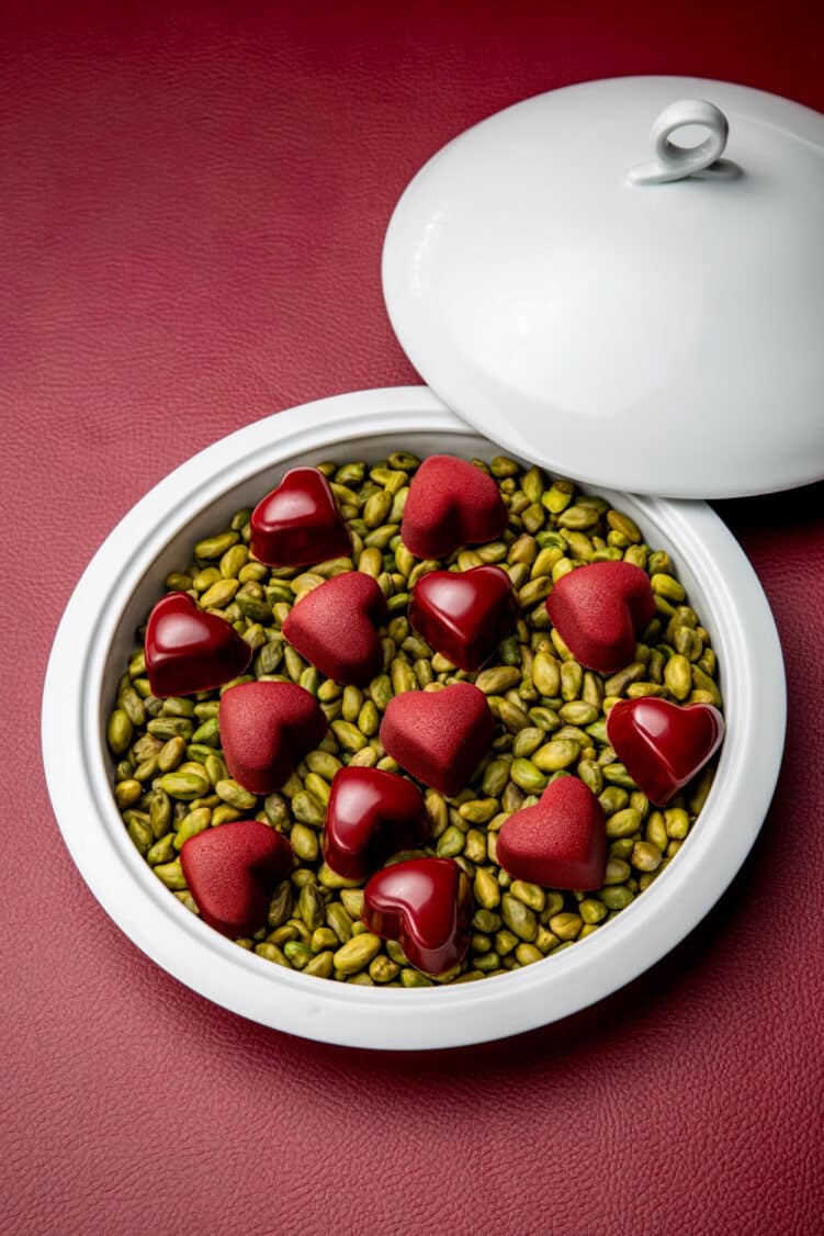 Les Petits Cœurs donnent le ton. Sous leur apparente douceur, ils révèlent un travail fin des textures : riz soufflé croustillant, caviar de vanille de Tahiti, praliné délicat et pistache d’Iran au crémeux mesuré. Deux expressions d’un même geste, pensées pour se répondre en bouche. On y retrouve cette sensation chère au chef : le plaisir vient autant de la mâche que de l’arôme.