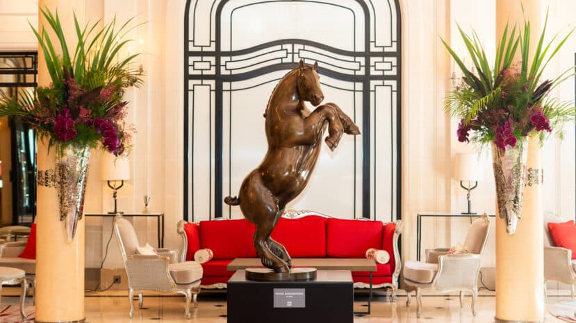 Pour Michel Bassompierre, le cadre du Plaza Athénée magnifie ses créations. La hauteur sous plafond permet d’installer des pièces monumentales. De même, les matériaux nobles du décor font écho au bronze patiné des sculptures.