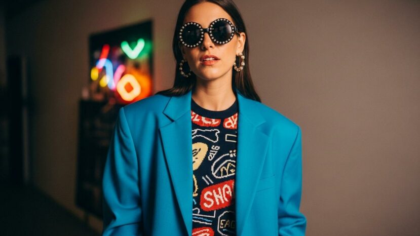 Le rose fuchsia, le bleu électrique et le jaune vif dominent les collections actuelles. Ces teintes audacieuses incarnent parfaitement l’esprit exubérant de la décennie. En revanche, elles se portent désormais avec plus de subtilité qu’à l’époque.
