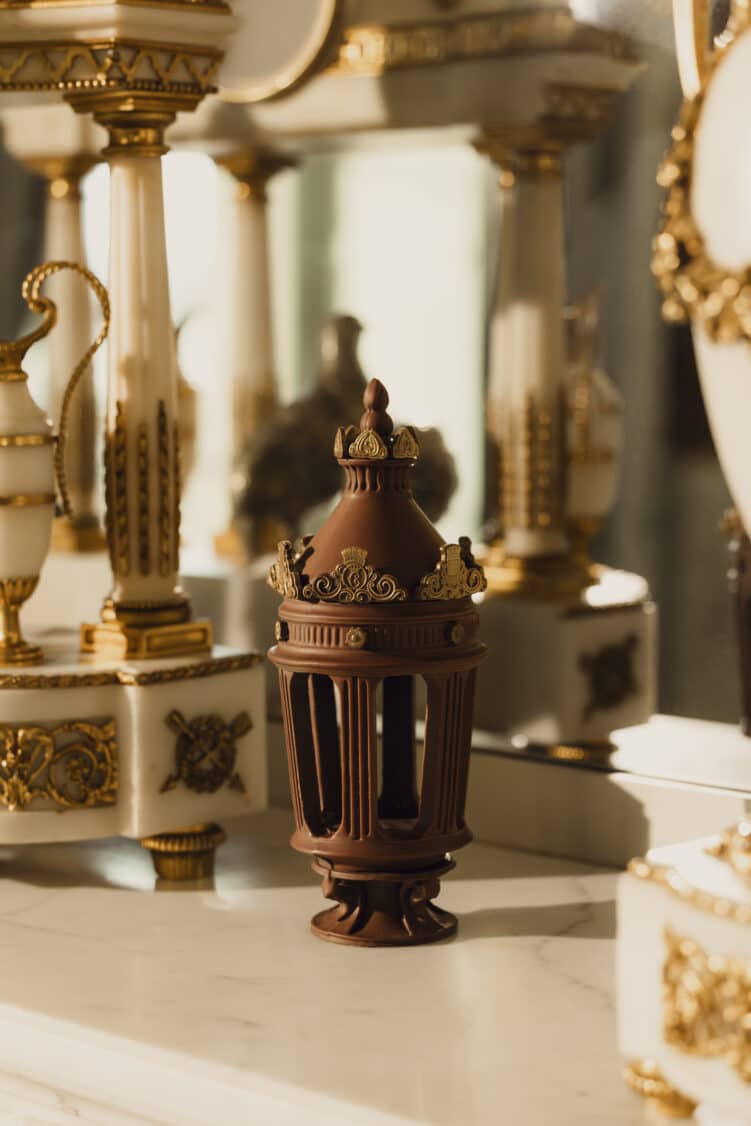 Pour Pâques, Matthieu Carlin dévoile une œuvre en chocolat inspirée du lampadaire emblématique de la Place de la Concorde. Cette pièce décorative, à la fois hommage au patrimoine architectural parisien et prouesse pâtissière, associe chocolat au lait grand cru 42 % et chocolat noir 66 %. Le sommet et la base révèlent un praliné amande-noisette croustillant, enrichi de brisures de gavotte, pour un subtil jeu de textures fondant et croquant. Véritable objet d’art, l’œuf intègre discrètement le logo de l’Hôtel de Crillon et le symbole de la Ville de Paris, illustrant le raffinement et l’inspiration historique du palace.