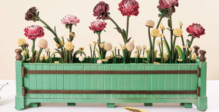La Jardinière est la pièce maîtresse de cette collection. Inspirée des bacs en bois de l’Orangerie de Versailles, elle fait éclore un jardin structuré et graphique avec 9 pivoines, 9 dahlias pompons et 45 marguerites et pâquerettes, sculptées et façonnées en chocolat blanc, lait et noir.