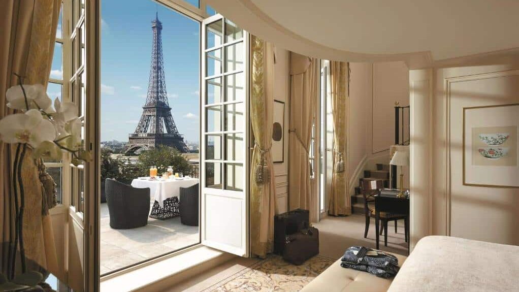 Ancien palais princier, cet hôtel iconique offre l’une des vues les plus spectaculaires sur la Tour Eiffel. Certaines chambres et suites permettent de l’admirer directement depuis le lit ou la baignoire… un moment suspendu.