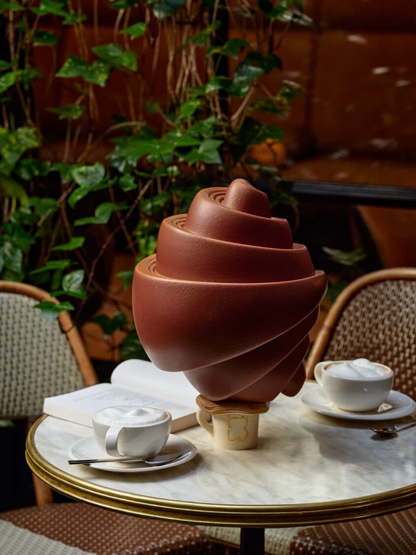 Le Burgundy Paris propose de son côté un « Café-croissant » monumental signé Léandre Vivier. Cette sculpture chocolatée évoque subtilement l’œuf de Pâques tout en célébrant l’iconique viennoiserie française. Le chocolat dark milk Sioka 56% de Valrhona s’associe au praliné amandes et café Panama pour une expérience gustative intense.