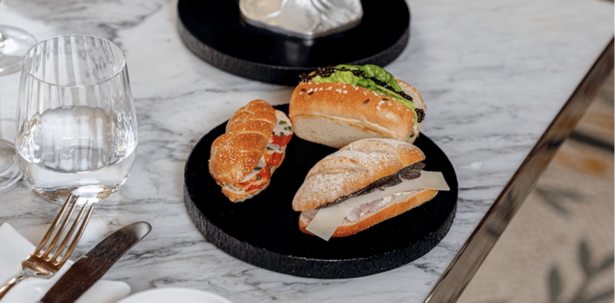 Le rituel commence par une série de bouchées salées, pensées avec précision. Pain moelleux garni de homard, mini-sandwich au saumon délicatement relevé, ou encore clin d’œil parisien à la baguette, twistée avec des produits d’exception. Rien n’est laissé au hasard. Les textures se répondent, les saveurs restent nettes, sans jamais saturer le palais.