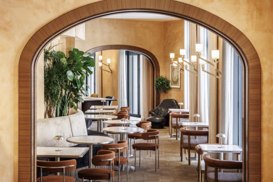 Dès l’entrée, la promesse se lit dans les matières. Bois profond, marbre Calacatta, travertin, briquette, chaux lissée, miroir vieilli, parquet de Versailles : ici, la main cherche presque la texture avant même de regarder la pièce. Le lobby, baigné d’une lumière douce, joue la carte d’un confort enveloppant. Plus loin, The Club ouvre un espace vivant pour travailler et échanger, tandis que The Library installe une parenthèse plus silencieuse, presque studieuse. Tout a été pensé sur une année de conception, avec un soin visible jusque dans les finitions.