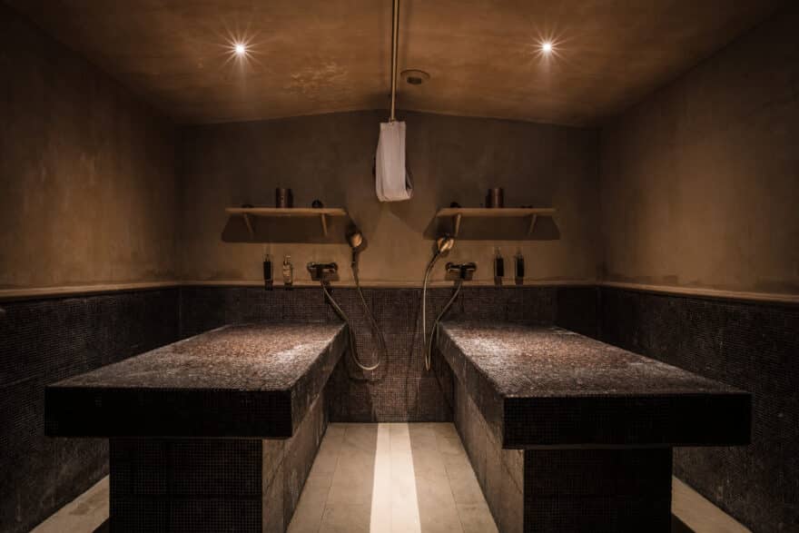 Au sous-sol, le hammam installe une atmosphère enveloppante. La vapeur adoucit la peau, les bancs de marbre chauffent doucement le corps, les arches et les niches lumineuses composent un décor inspiré des rituels orientaux. Le hammam s’étend sur 70 m², avec une salle chaude et une salle tiède. Le gommage se pratique au gant de kessa, dans un geste franc, presque libérateur.