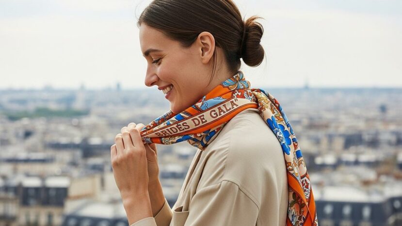 The silk square becomes a module, then a support. At Hermès, it is knotted to form a precise bust. As a result, the top gains tension without losing freedom. In short, the gaze is fixed on the fastening.