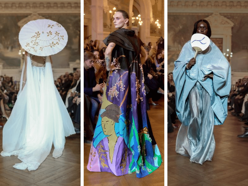 Presented on October 1, 2025 at the Asnières-sur-Seine town hall, Eddie Corps’ SS26 collection was inspired by Edo period Japan, blending tradition and modernity. The guest artist created a hand-painted haori coat, the show’s centerpiece, as well as three exclusive accessories – an umbrella and two fans – that extend the visual narrative.