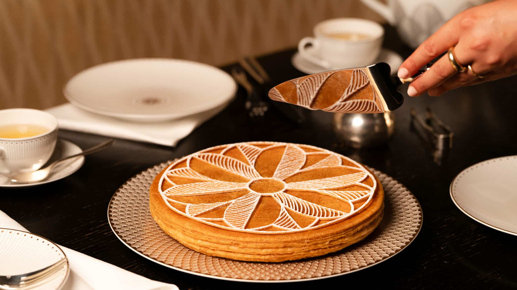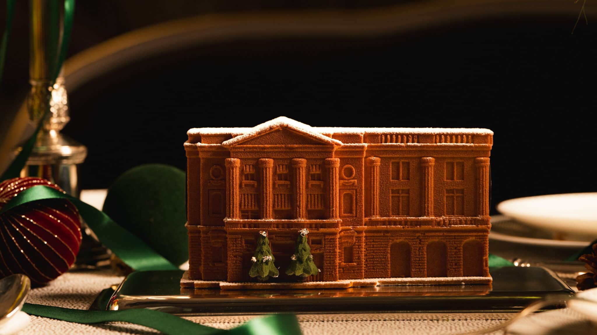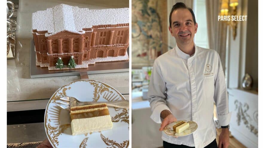 At the heart of this collaboration is Pastry Chef Matthieu Carlin ‘s exceptional creation, inspired by Christofle’s Malmaison Impériale motif. The log features a miniature version of the palace’s majestic façade, framed by two white chocolate fir trees. Gourmet and regressive, it unfurls an architecture of flavors where Madagascar vanilla mousse marries with almond and speculoos praline crunch, while apple compote and a soft cookie complete this refined composition. The result is a log that is both precise and generous, combining the elegance of Crillon’s heritage with the chef’s contemporary signature.