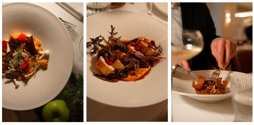 Chez Carrie revisits Thanksgiving with a strong plant-based inspiration. The menu features buckwheat nachos, a mushroom-chestnut velouté, turkey confit with herbs and several modern accompaniments, including squash-celery polpettes. The desserts take up the US codes, but with a personal touch. A daring Thanksgiving, served over several dates.