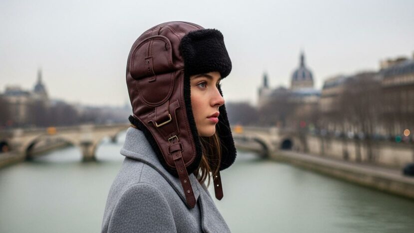 Ugo Zaldi – Brown leather aviator chapka, lined and stable. The smooth leather cuts through the wind, and the earflaps give a clean look.