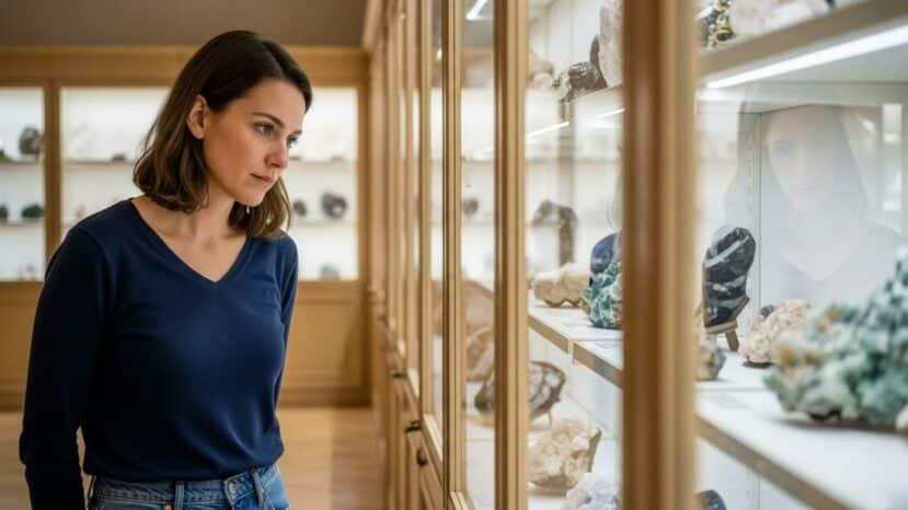Visitors move between rough minerals and cut gems, with clear connections. Moreover, the exploration of colors, inclusions and cleavages makes the material legible. This exhibition shows how cut reveals light, step by step, just as certain winter dresses sublimate the fall of a fabric.