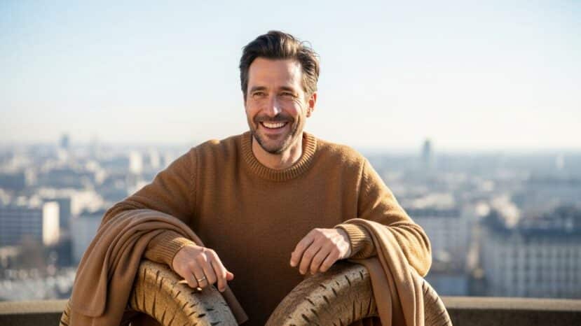 Its power lies in the fabric and the way it falls. A medium knit, a round collar, a well-placed shoulder, and you’re done. Contrasting textures create relief.