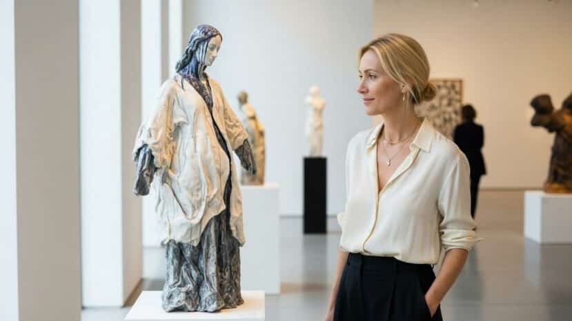 Among the artists featured, Julia Haumont stands out for her work in glazed earthenware. Her work “Untitled (sculpture n°41)” measures 110 x 50 x 33 cm and demonstrates remarkable technical mastery. This sculptural piece invites us to rethink the links between ceramics and textiles.
