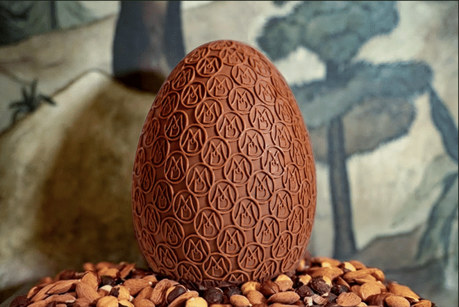 Created by chef Paolo Minelli and sous-chef pâtissier Enzo Ohayon, the Easter egg embodies a generous, masterful interpretation of chocolate. Beneath a fine 70% chocolate shell, discreetly marked with the house monogram, lies a heart of hazelnut and almond praline, worked with Piedmont hazelnuts and Tuono almonds from southern Italy. The texture, both melt-in-the-mouth and slightly crunchy, is accompanied by a hint of salt to structure the whole and reveal its nuances.