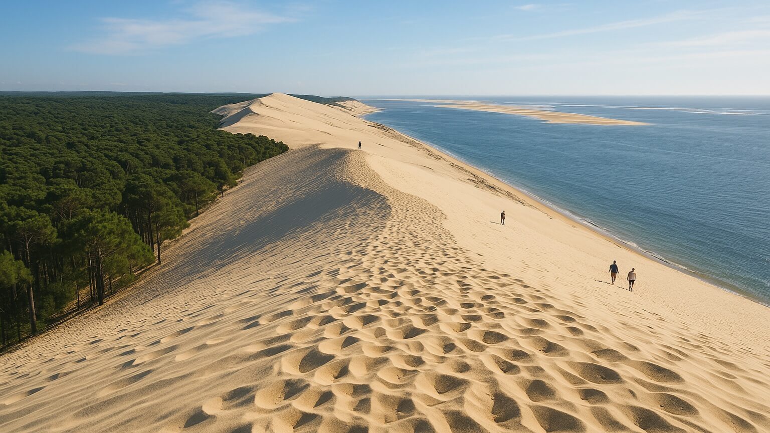 The Dune du Pilat is as impressive for its size as it is for the experience it offers. The highest dune in Europe, it offers a spectacular panorama of theocean, the Landes forest and the Banc d’Arguin. The ascent, on foot in the sand, is an integral part of the visit. Once at the top, your gaze wanders between the shifting lines of the landscape and the changing light. The moment of sunset is particularly sought-after, when the colors warm up and the wind gently shapes the ridges. A simple but memorable interlude.